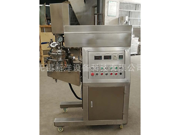 物料在水锅、油锅内通过加热、搅拌进行混合反应后,由真空泵吸入乳化锅,通过乳化锅内上部的中心搅拌、聚四氟乙烯刮板始终迎合搅拌锅形体,扫净挂壁粘料,使被刮取的物料不断产生新界面,再经过叶片的剪断、压缩、折叠,使其搅拌、混合而向下流往锅体下方的均质器处,物料再通过高速旋转的切割轮与固定的切割套之间所产生的强力的剪断、冲击、乱流等过程,物料在剪切缝中被切割,迅速破碎成200um-0.2um的微粒,由于乳化锅内处于真空状态,物料在搅拌过程中产生的气泡被及时抽走。采用抽真空的方式,使所生产的制品在搅拌过程中不再混入气泡,从而保证可制造出富有光泽、细腻及延展性良好的产品。